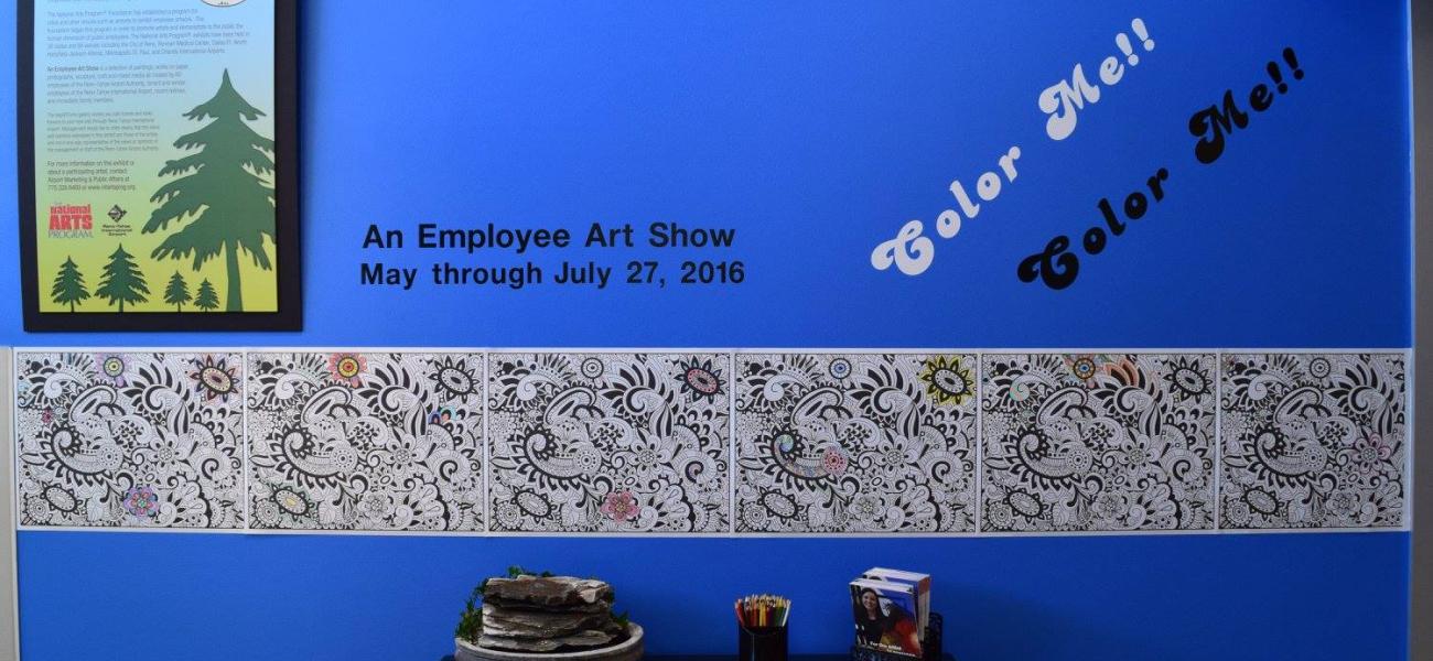 Kim Matthews had a fantastic idea for the 8th Annual Reno-Tahoe International Airport’s National Arts Program® Exhibit. She decided to create a coloring wall at the entrance of the gallery inviting everyone to participate in coloring it in. Kim stated that the wall, “filled in quite nicely thanks to Reno-Tahoe International Airport’s traveling passengers”.