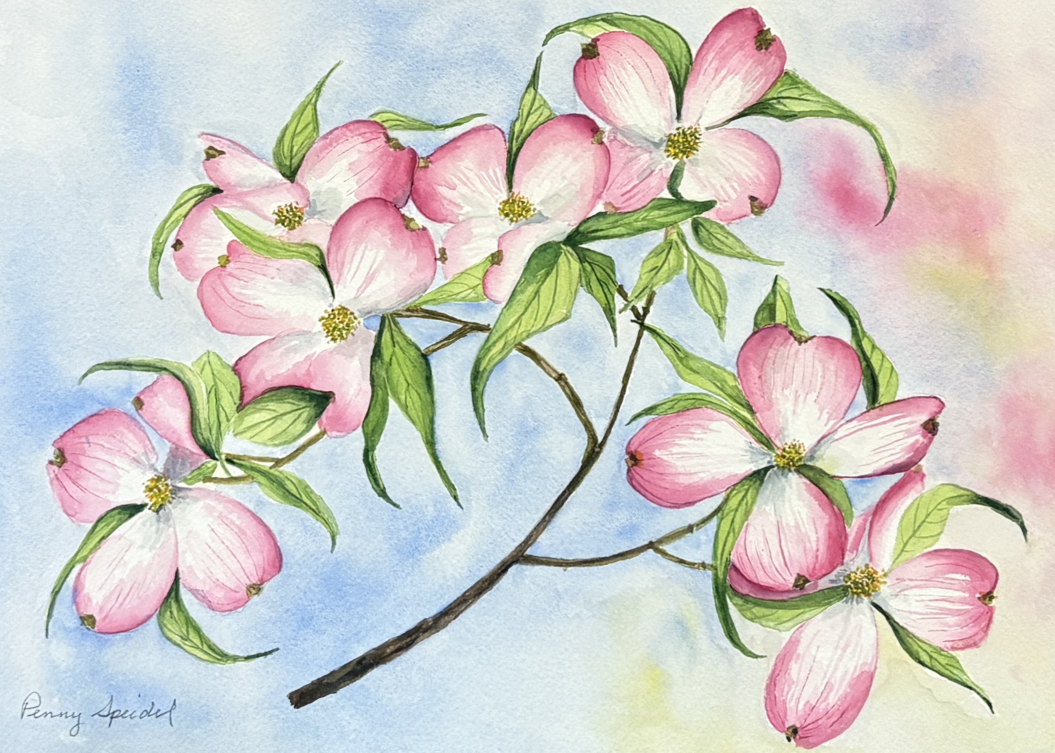 Every spring I look forward to seeing the beautiful blooms on the pink dogwood in my yard. This year, I decided to paint a branch of blooms. I had to work quickly before the blooms faded.