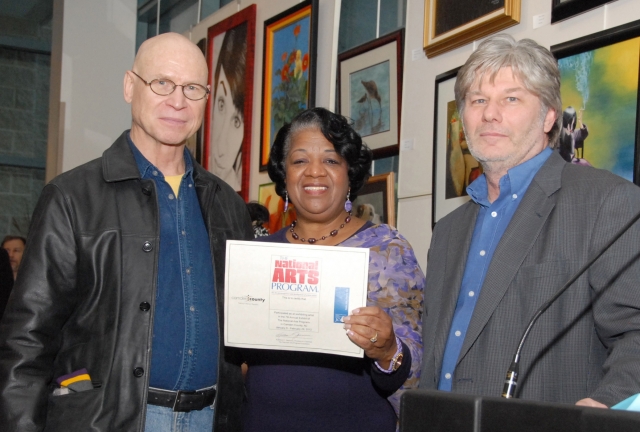 Signore 18610 7th Annual Exhibit Ted Warchal (L) with venue coordinator Sandra Turner-Barnes (C) and BRuce Garrity (R) Professional, Second Place Sculpture Resident; Camden County Camden County